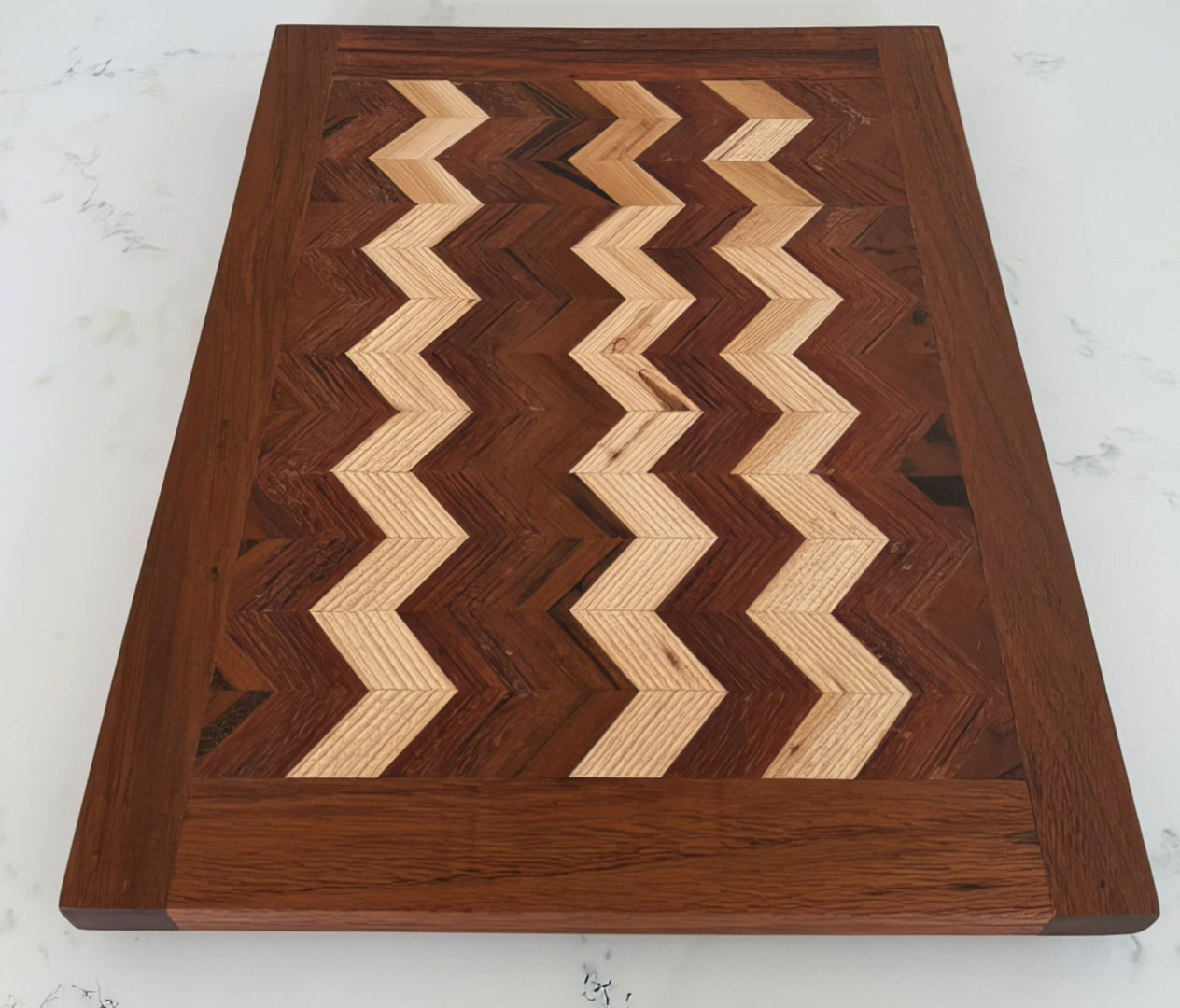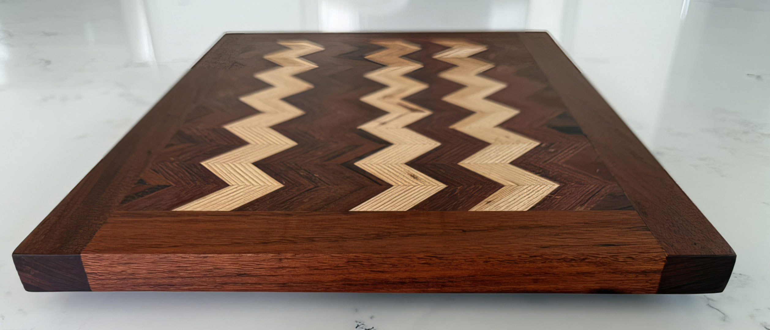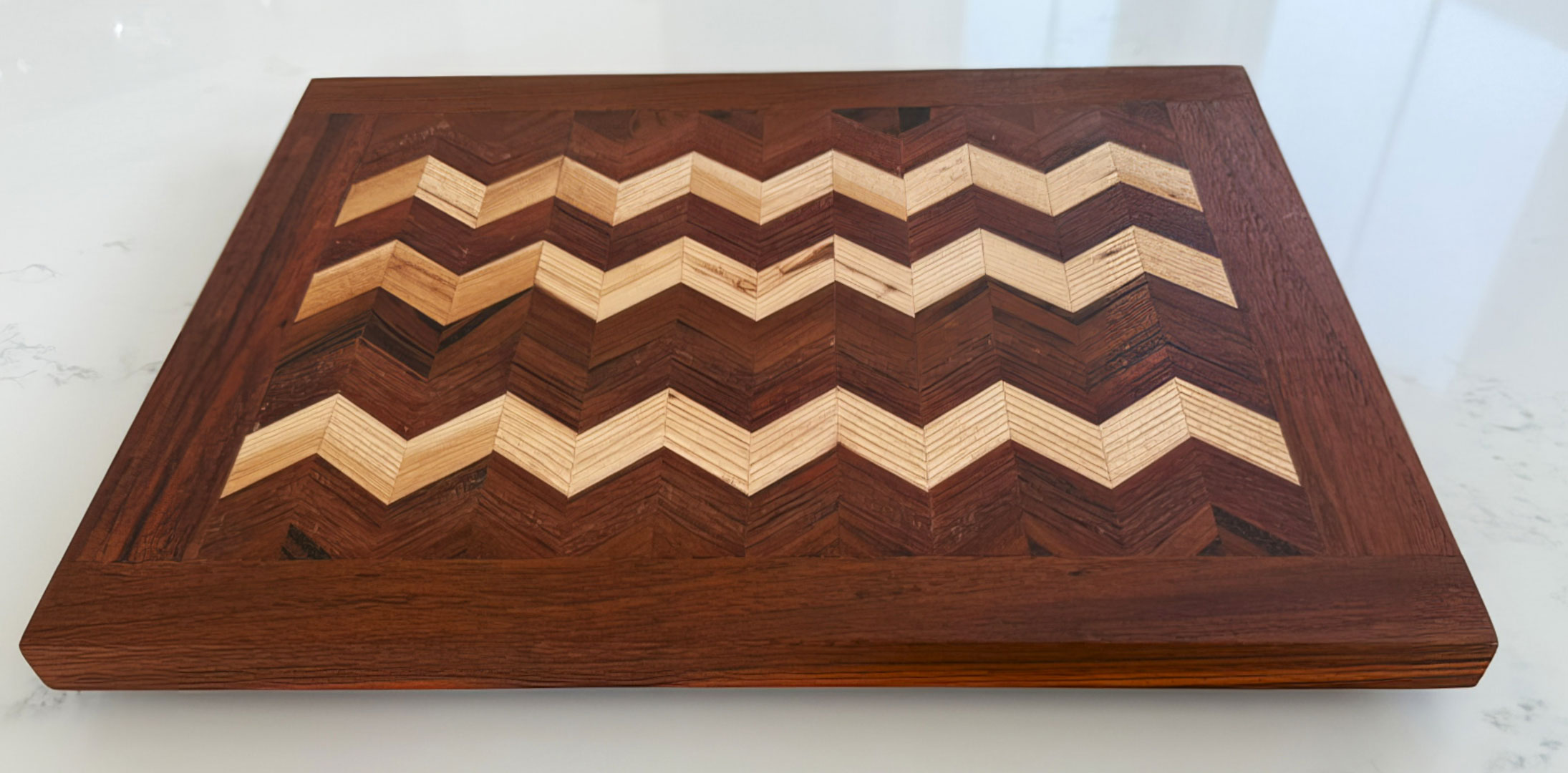 The 3D board consists of face grain South American Tigerwood, African Sapele and North American Maple.