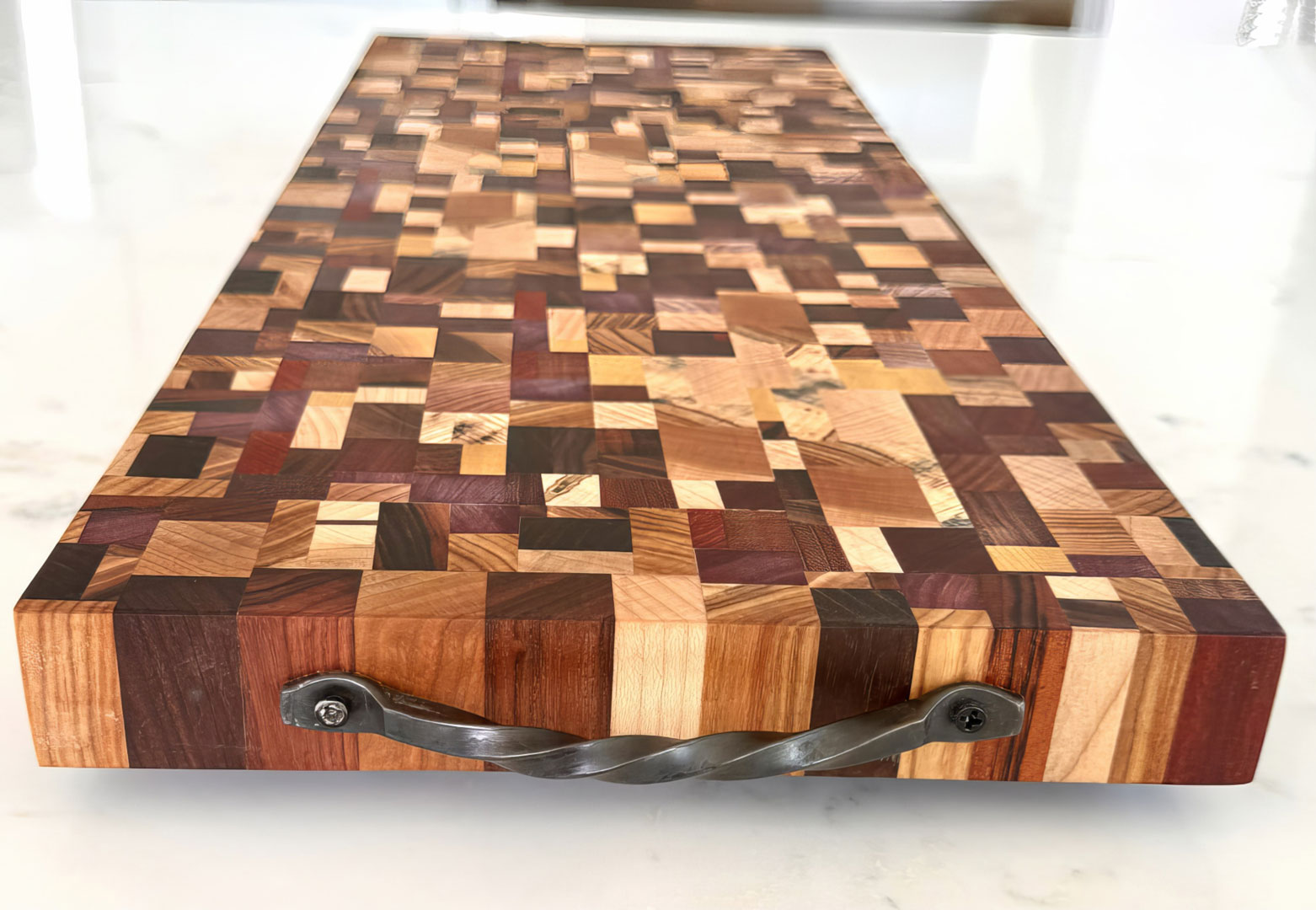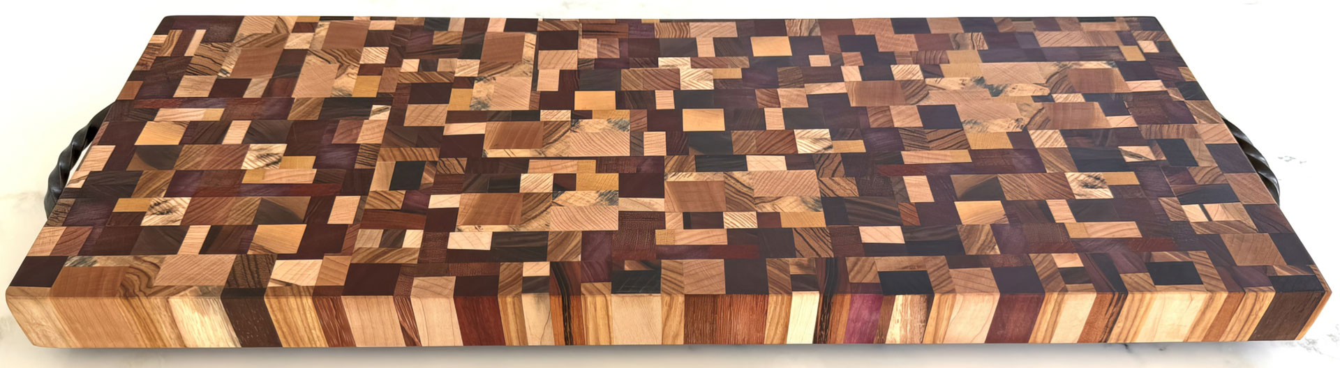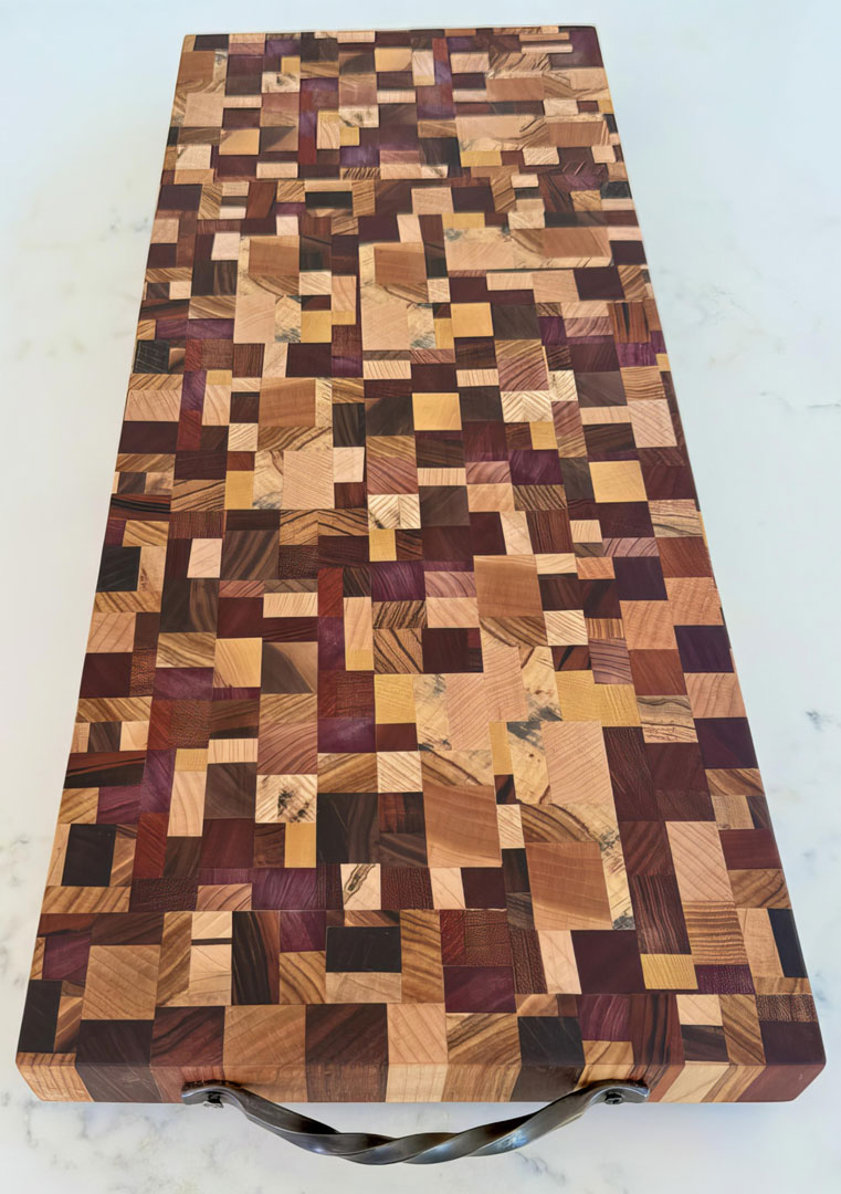 The entire board is end grain with over 800 pieces of wood that includes African Wenge, Yellowheart, ZebraWood, South American Brazilian Cherry, Canary Wood, Leopard Wood, Peruvian Walnut, Tigerwood, Central American Purpleheart, Mediterranean Olive Wood, Domestic Ambrosia Maple, Birch, Cherry, Maple, Hickory, Red Cedar, Spalted Hackberry & Walnut.
