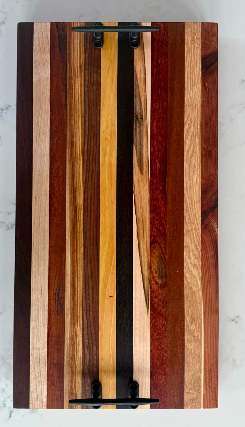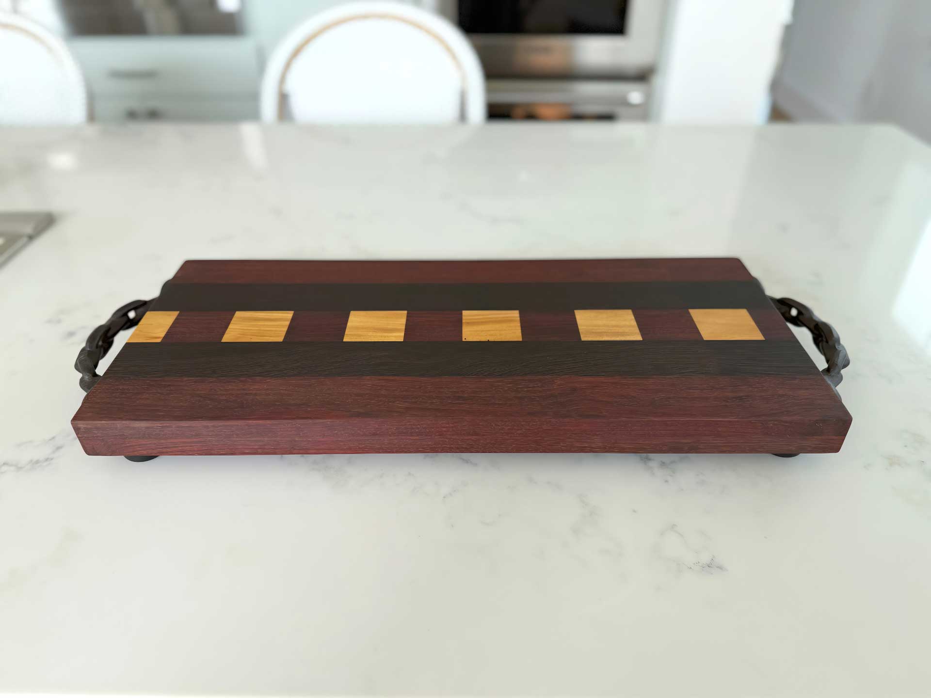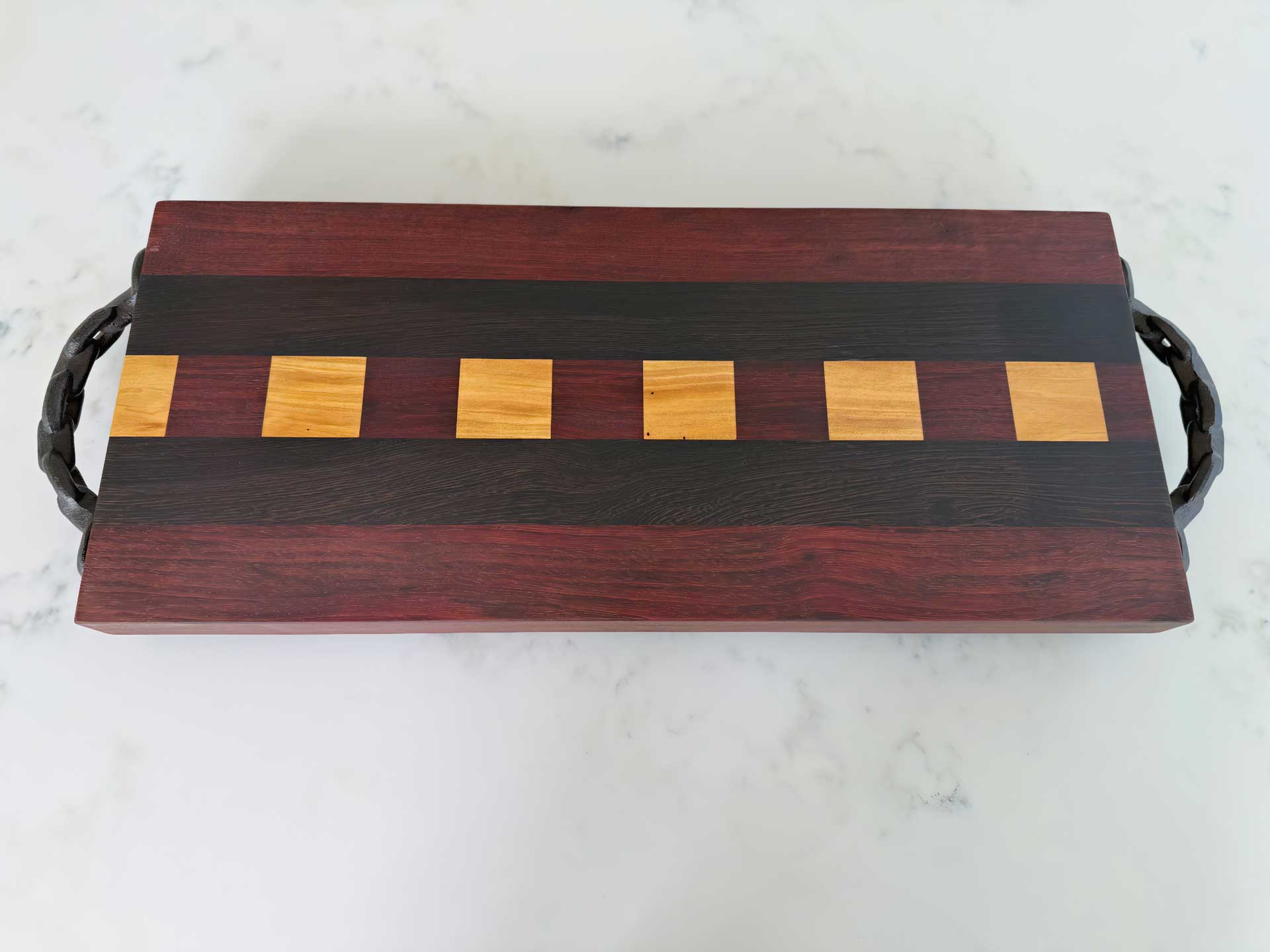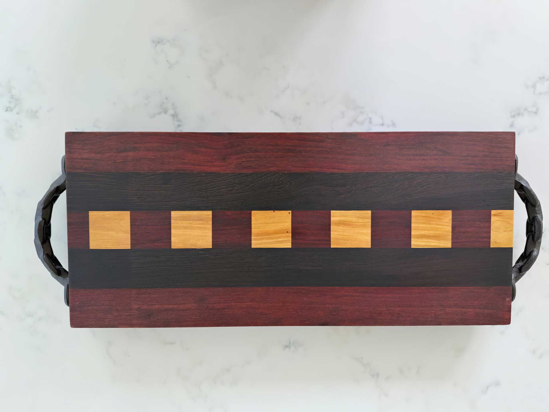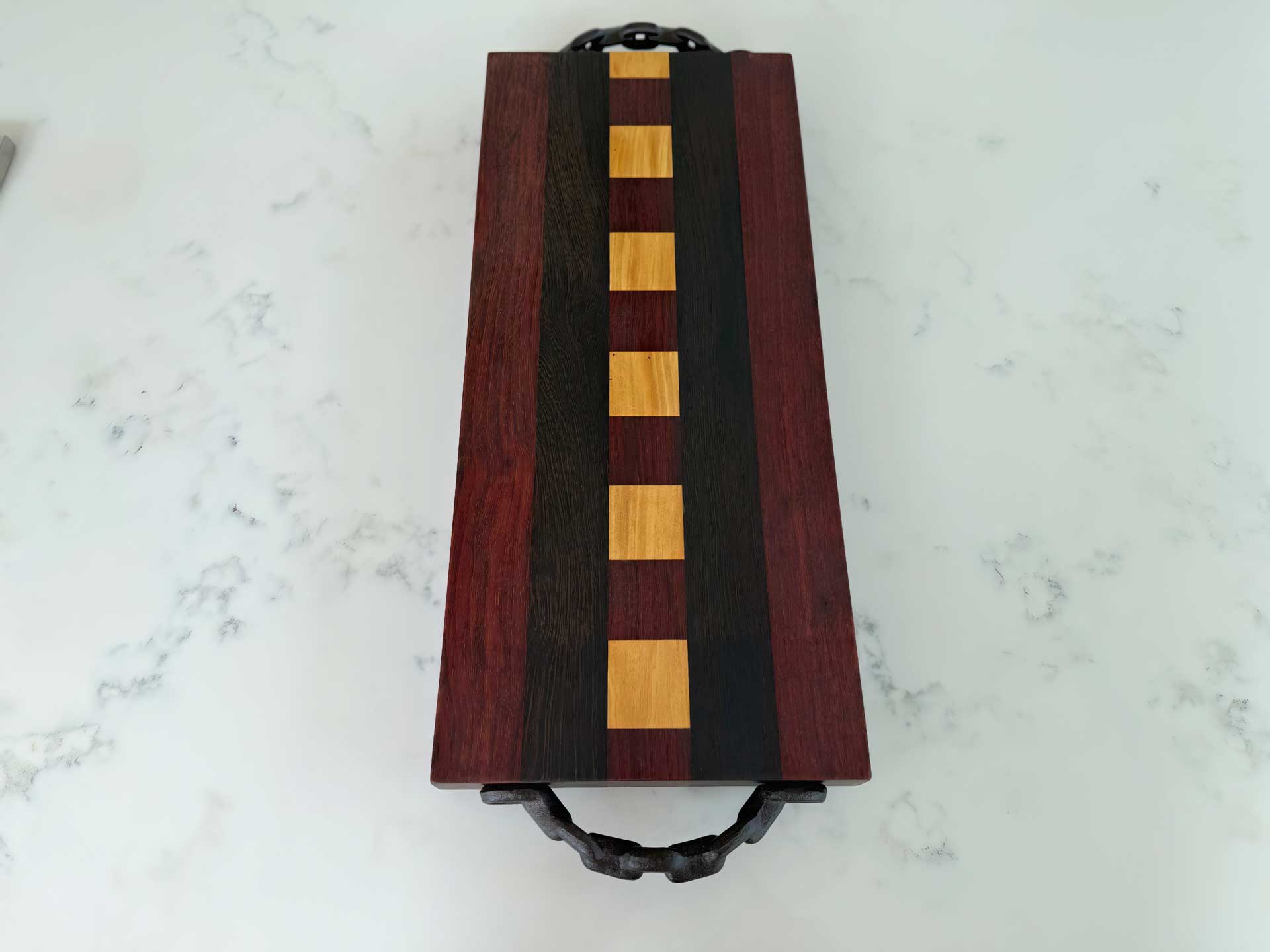 Face grain Brazilian Cherry, African Wenge & South American Yellowheart with wrought iron rope handles.