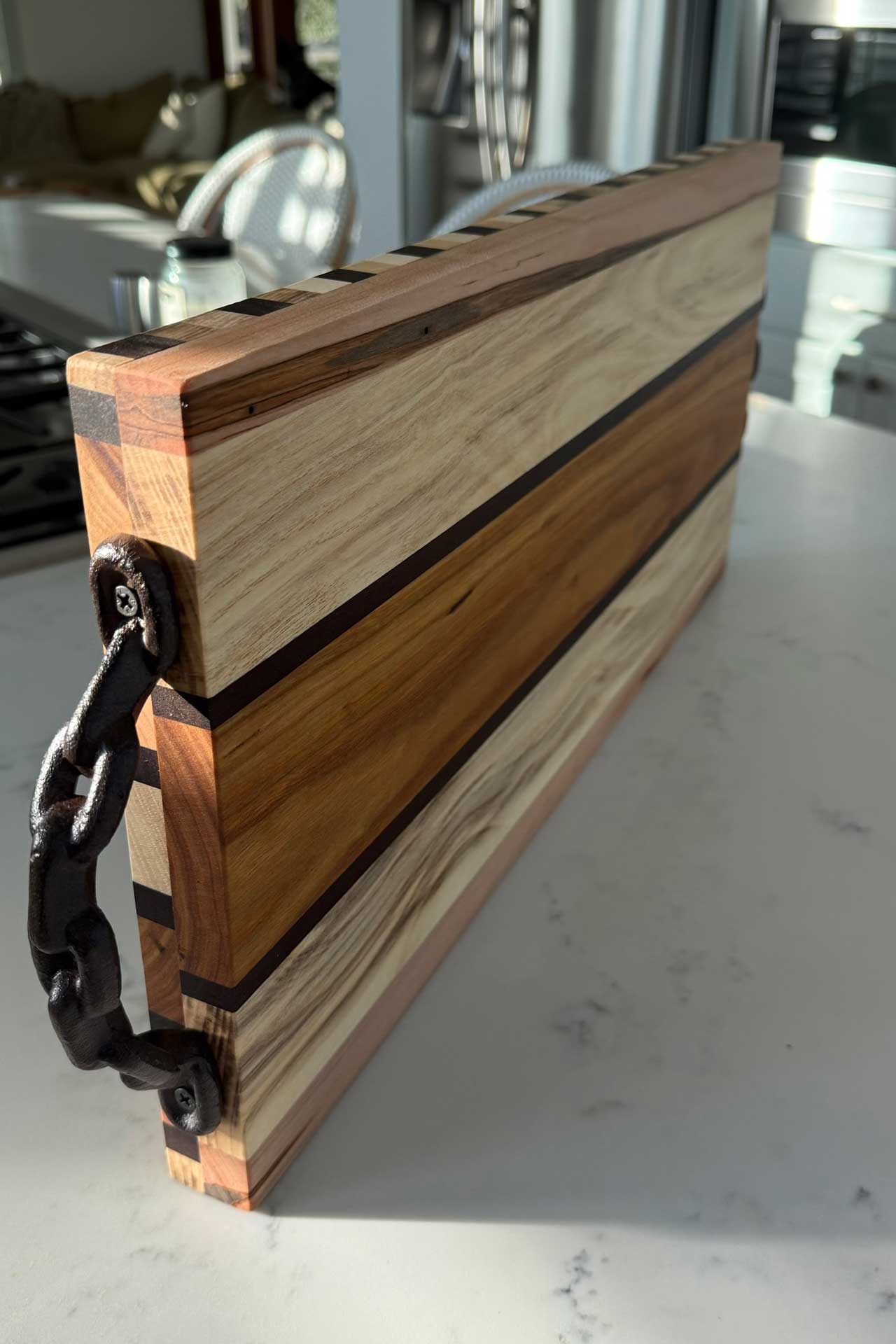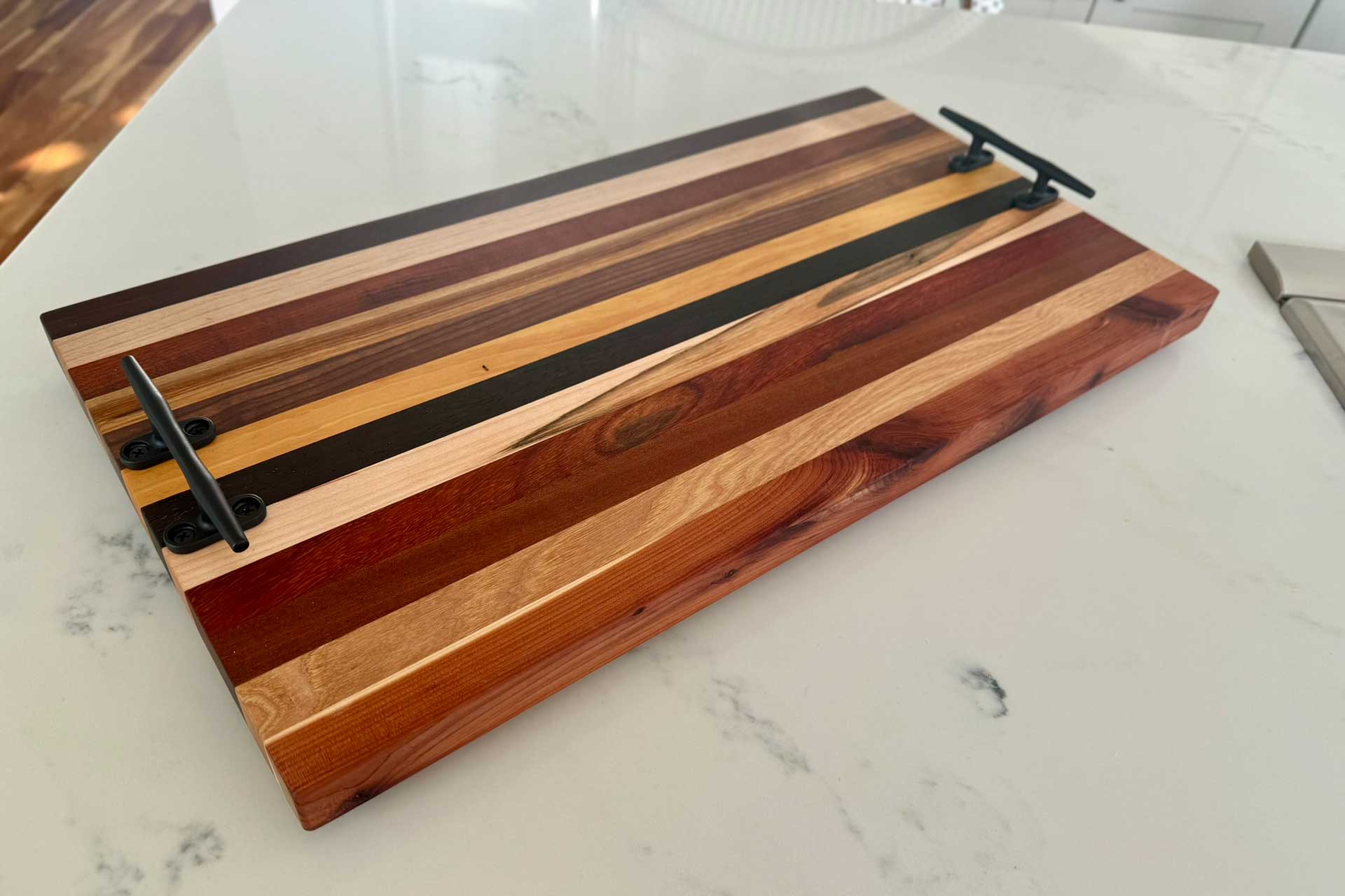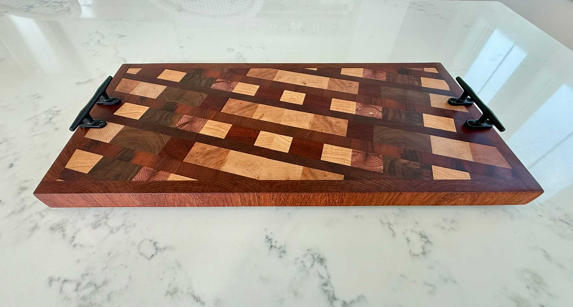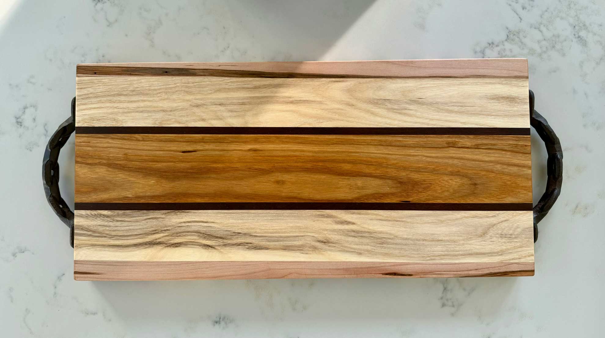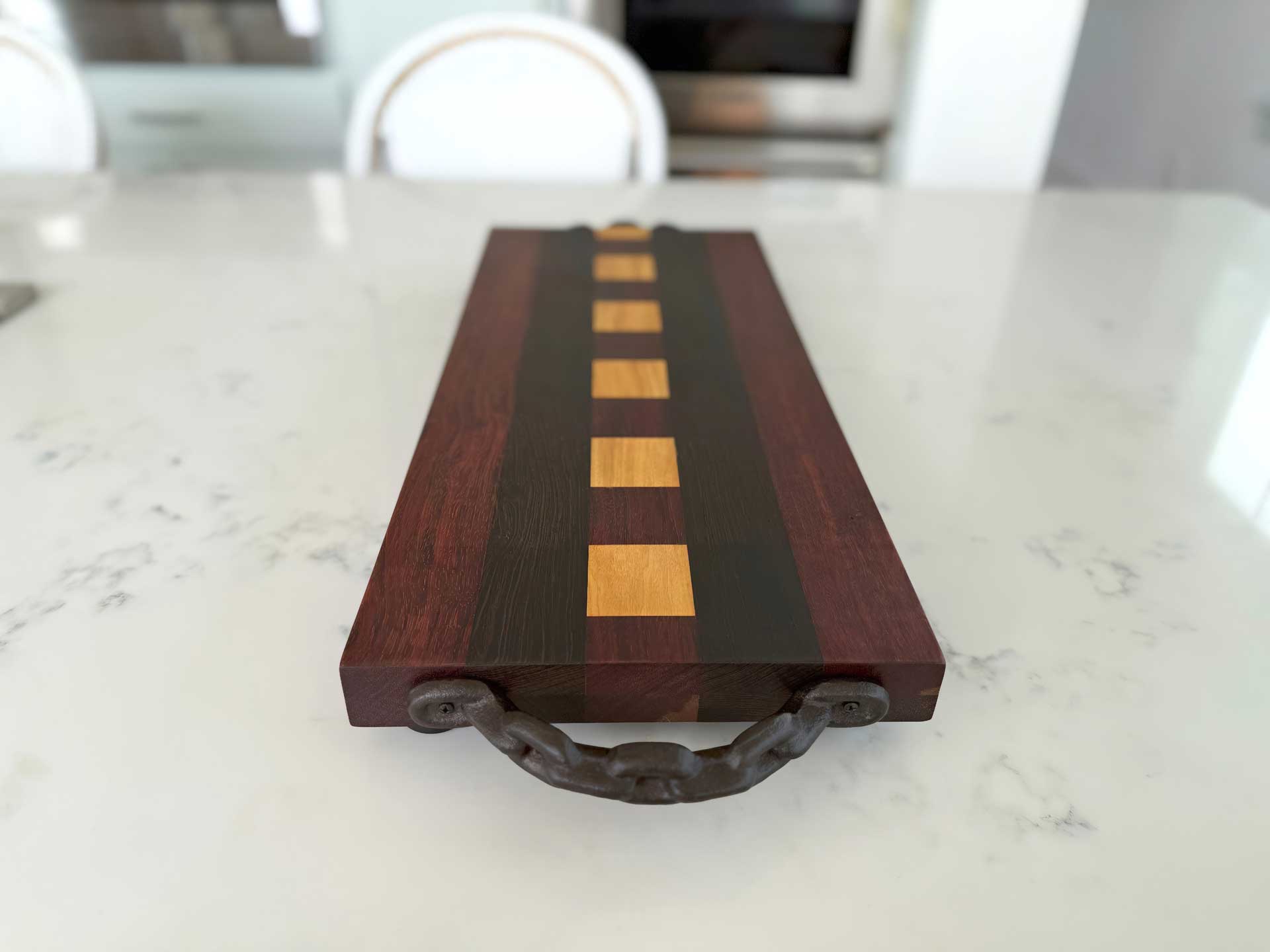 Face grain Brazilian Cherry, African Wenge & South American Yellowheart with wrought iron rope handles.