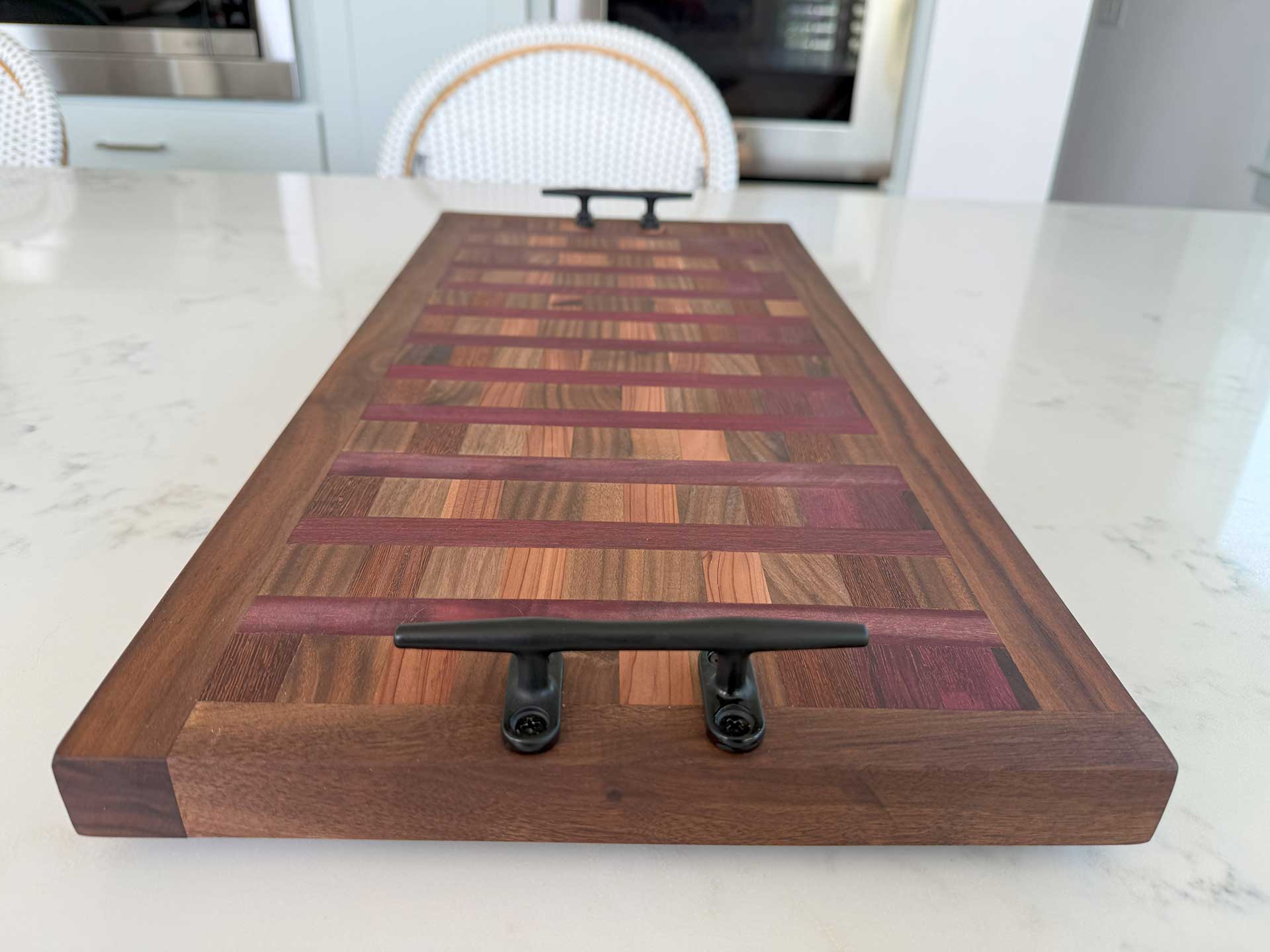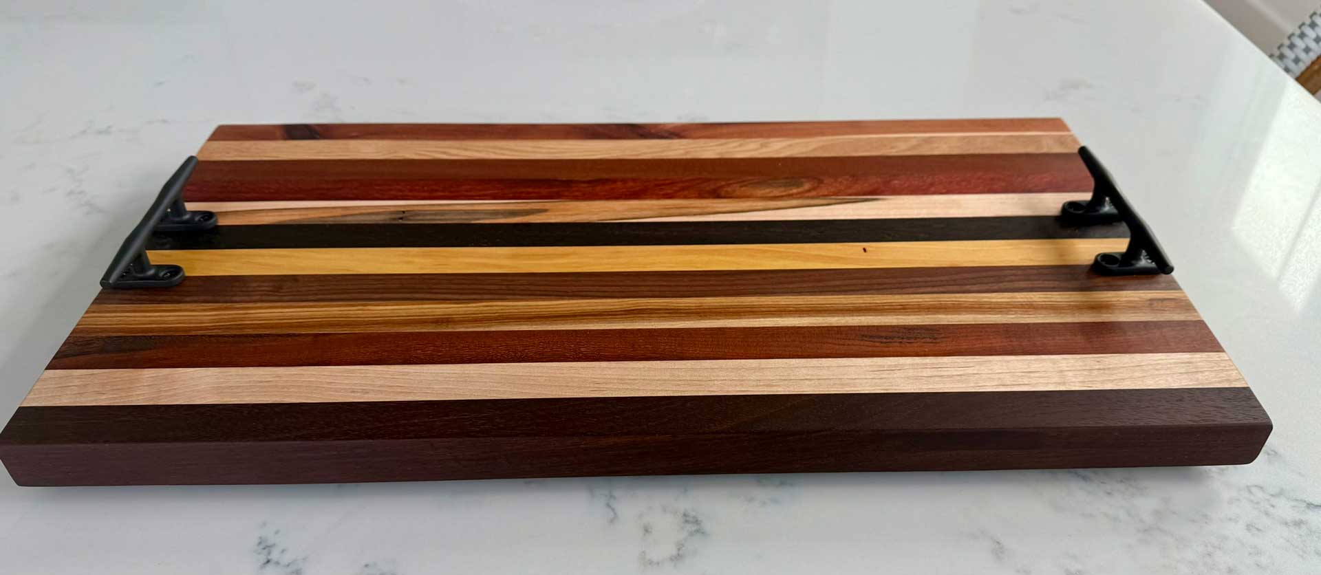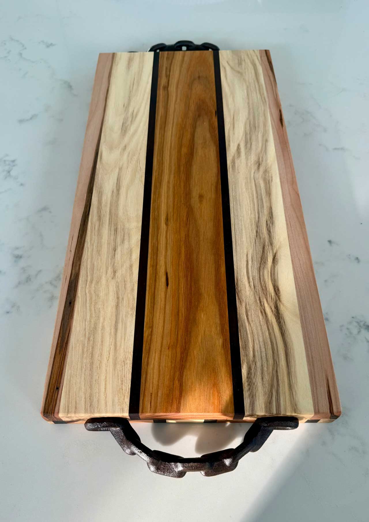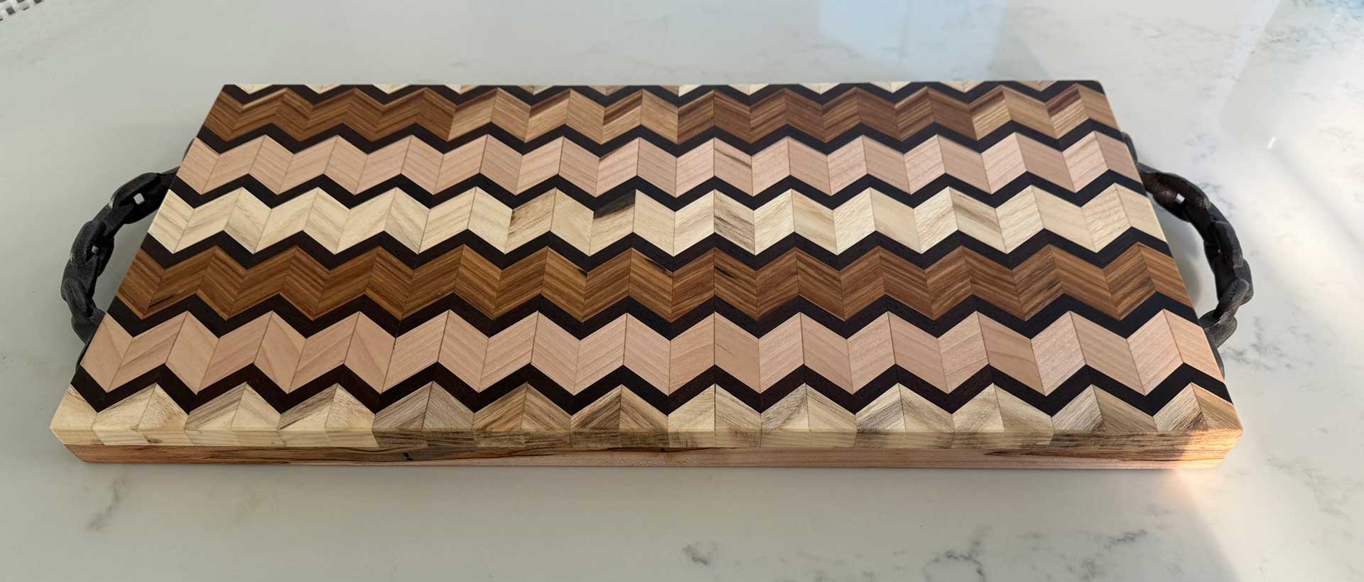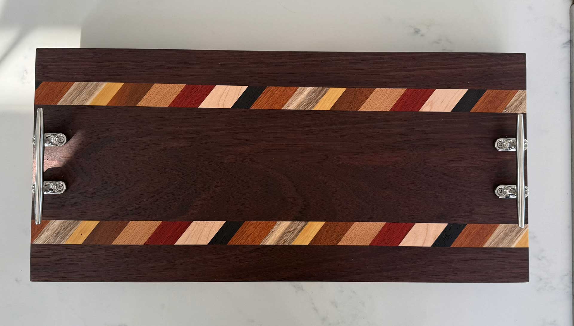 Face grain Brazilian Cherry, African Wenge & South American Yellowheart with wrought iron rope handles.