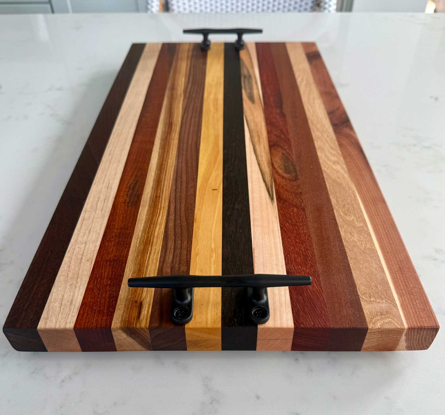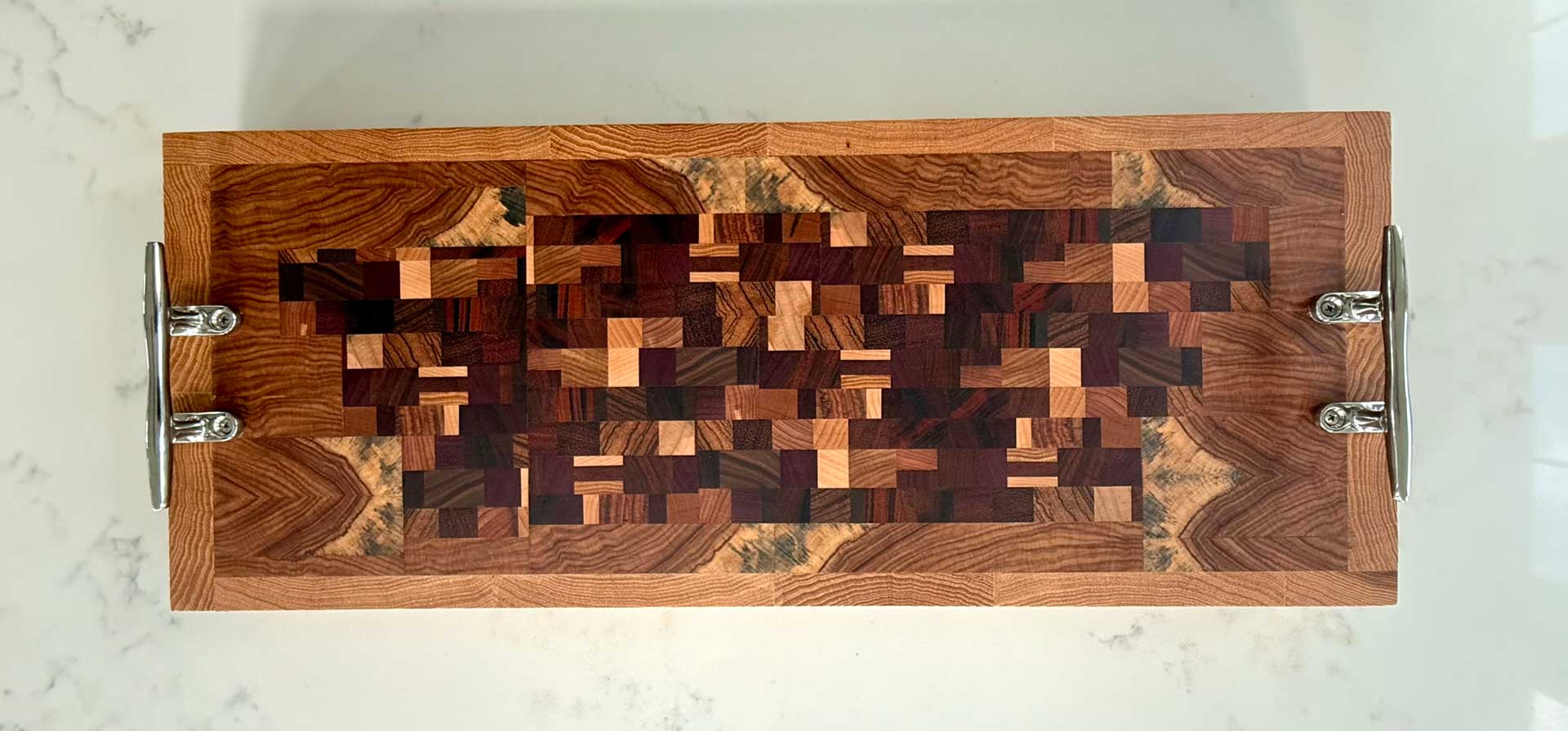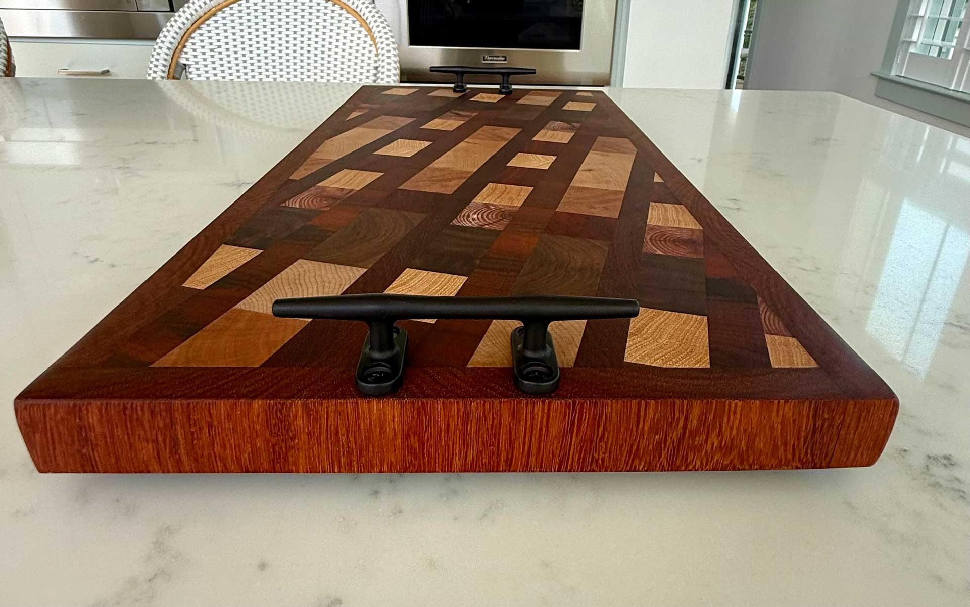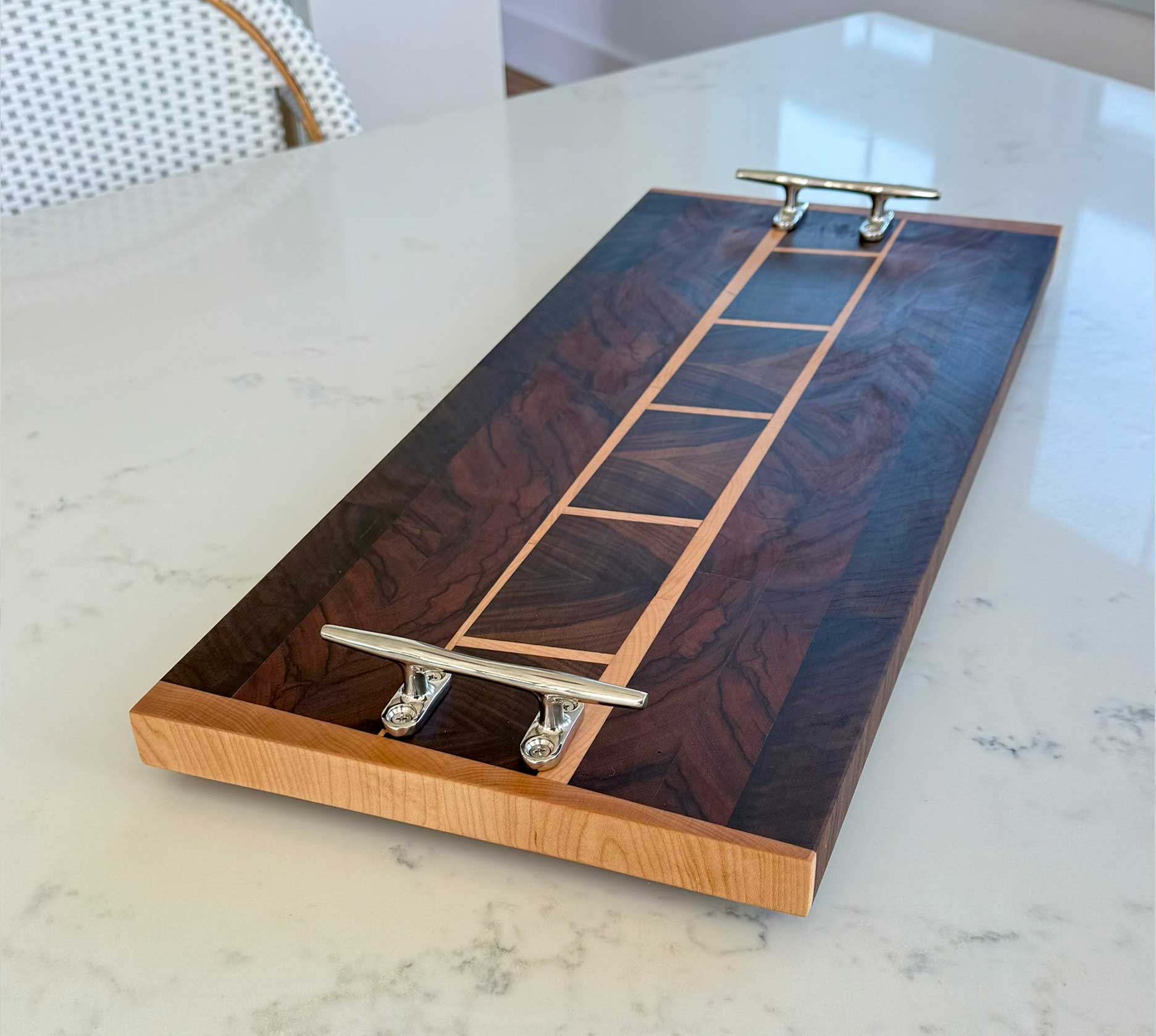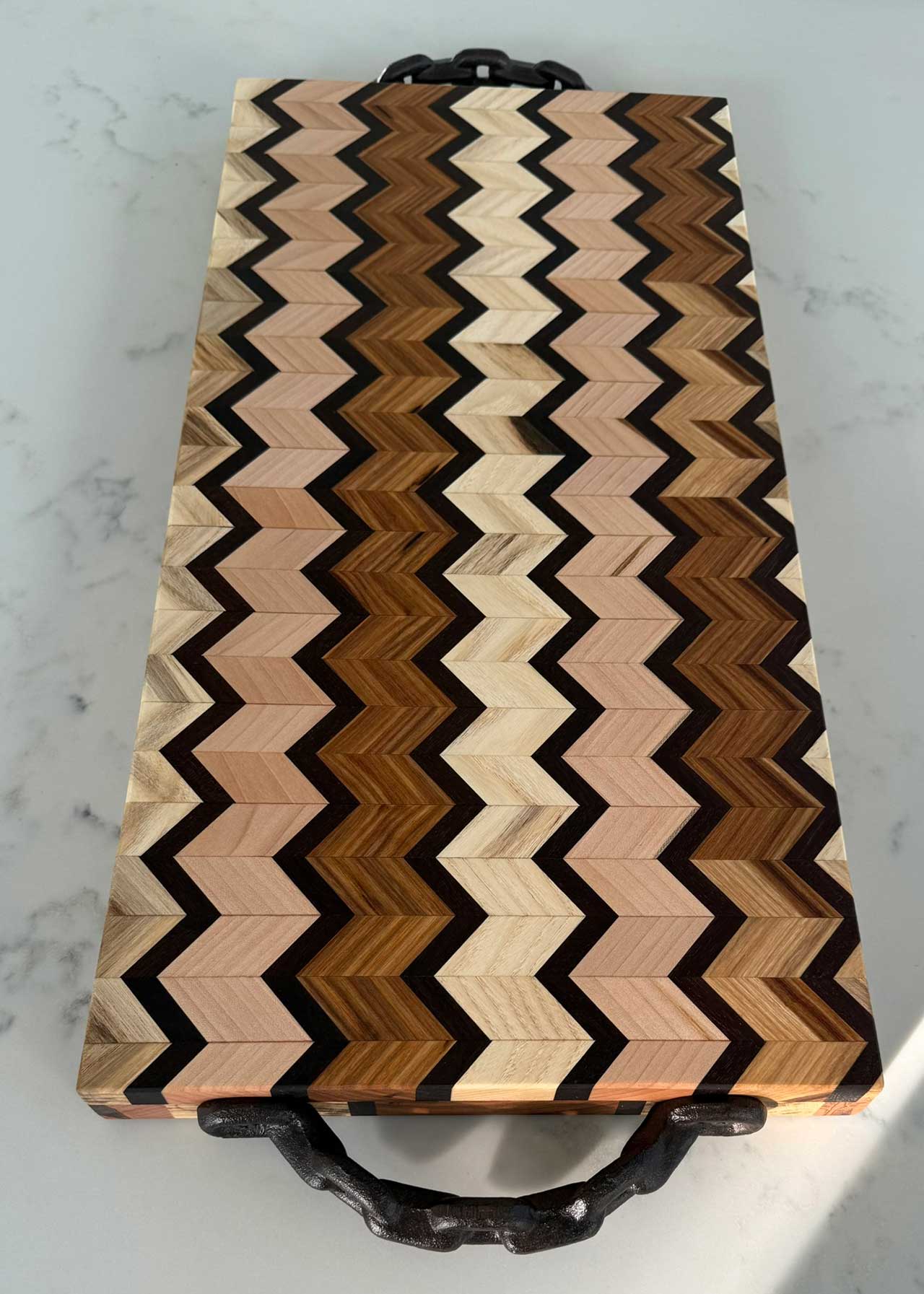 Face grain Brazilian Cherry, African Wenge & South American Yellowheart with wrought iron rope handles.