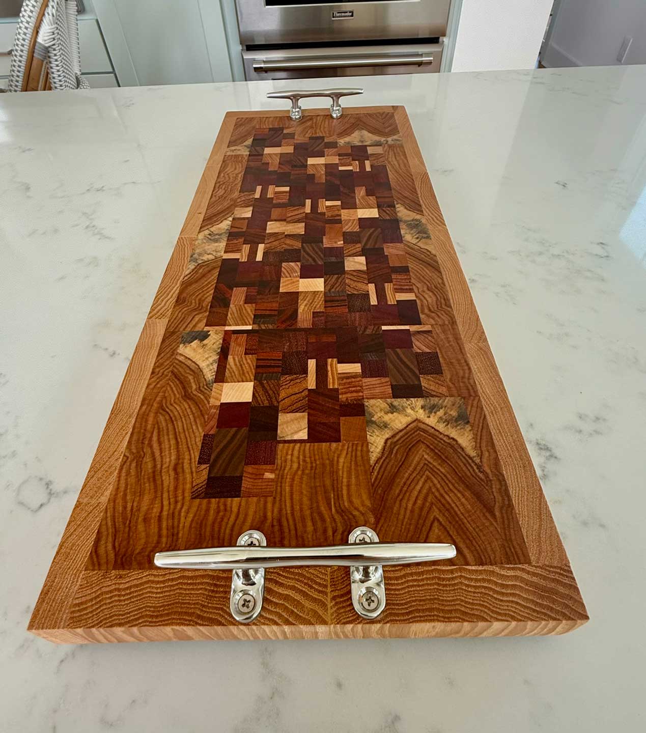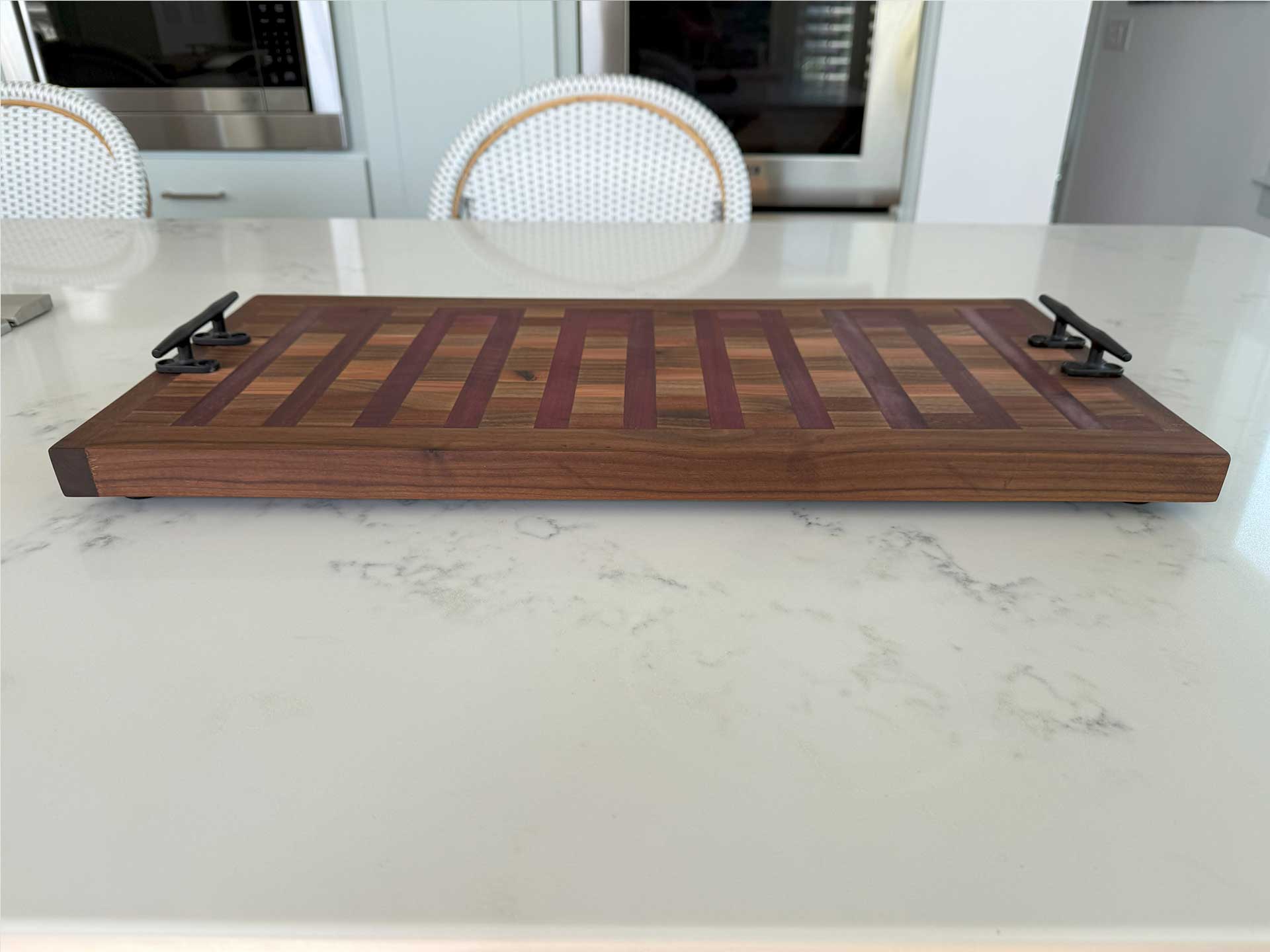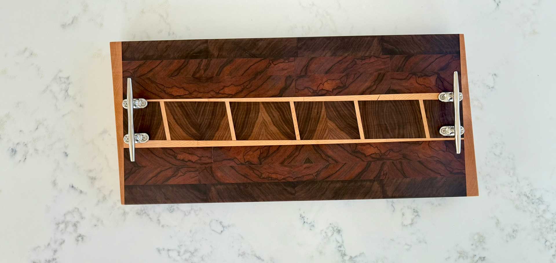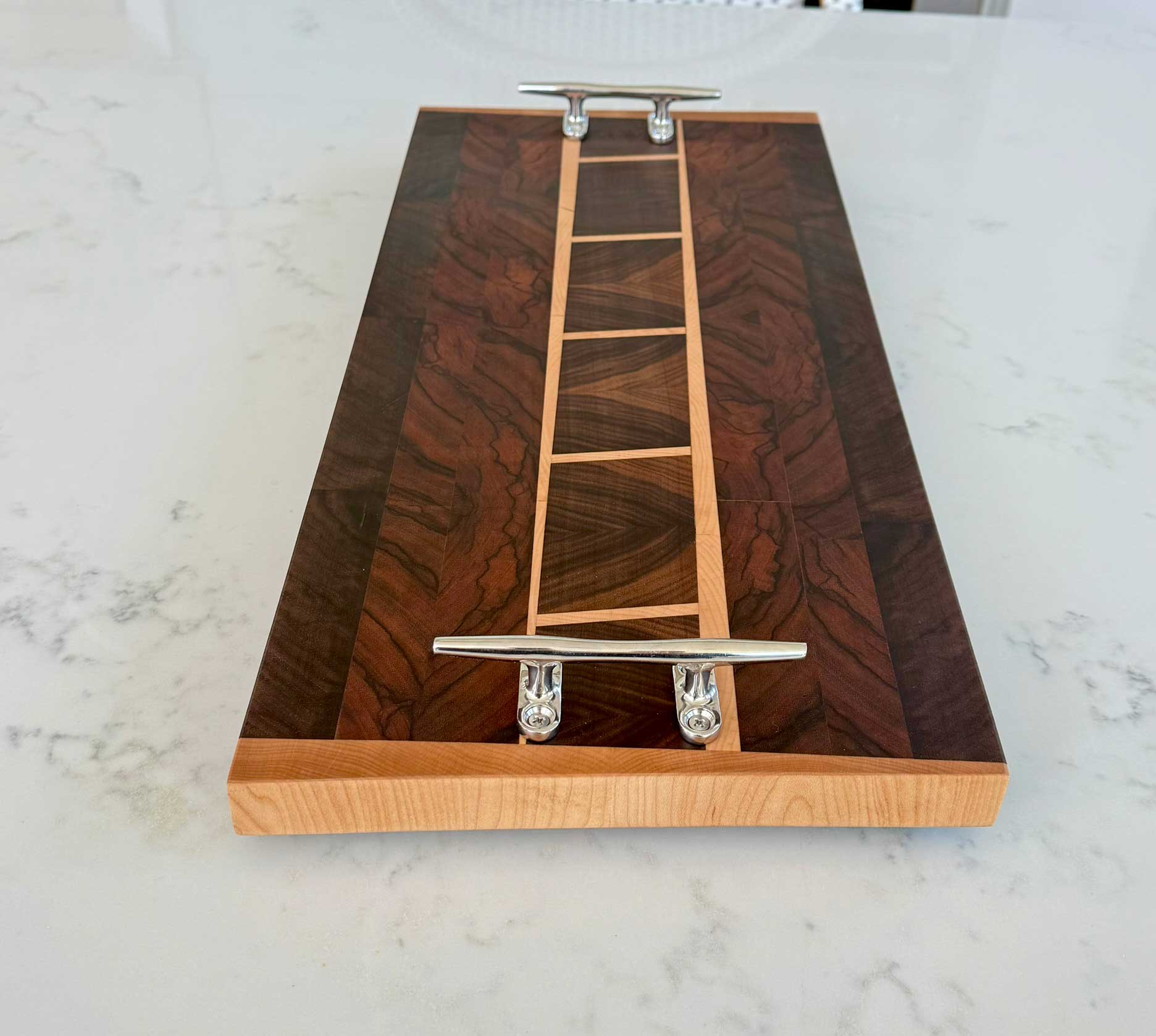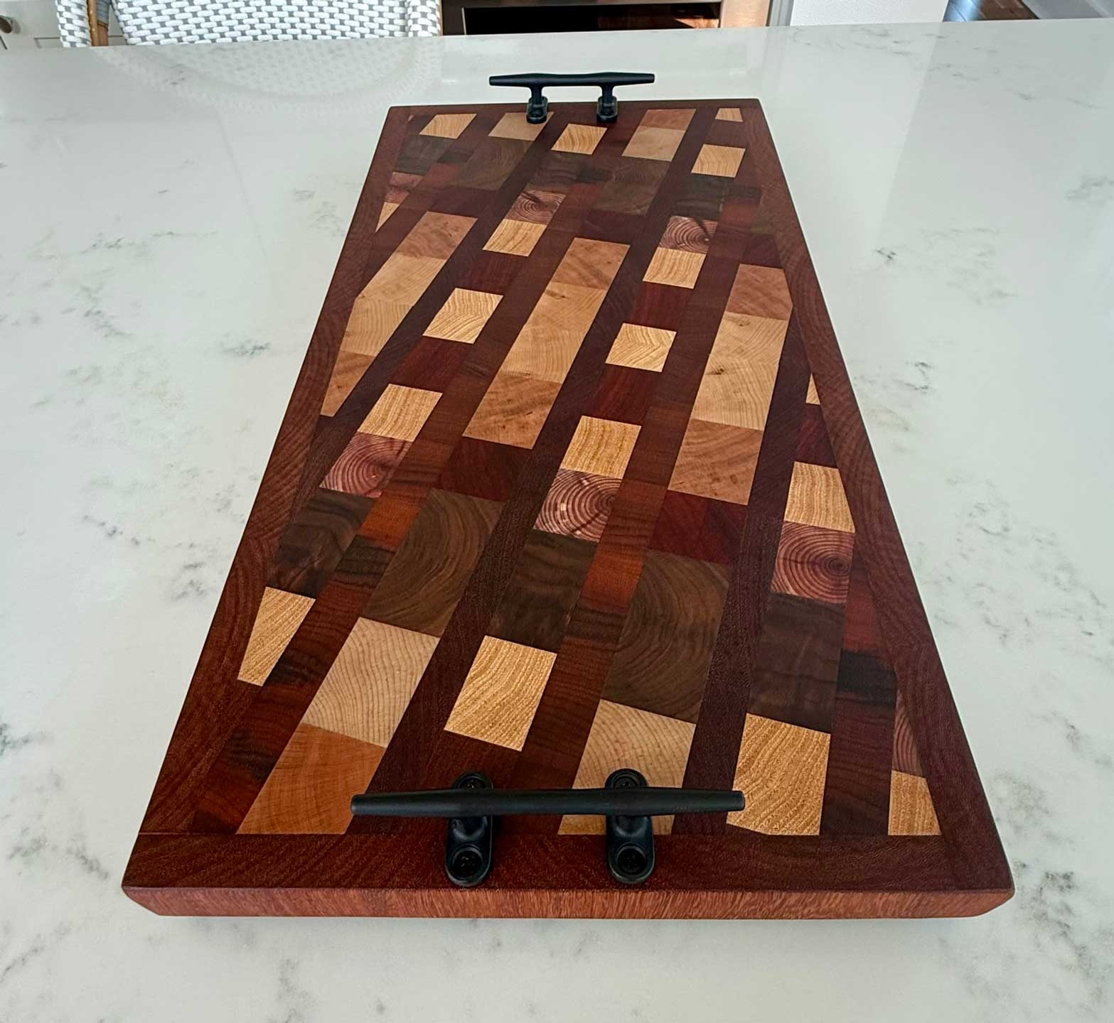 Face grain Brazilian Cherry, African Wenge & South American Yellowheart with wrought iron rope handles.