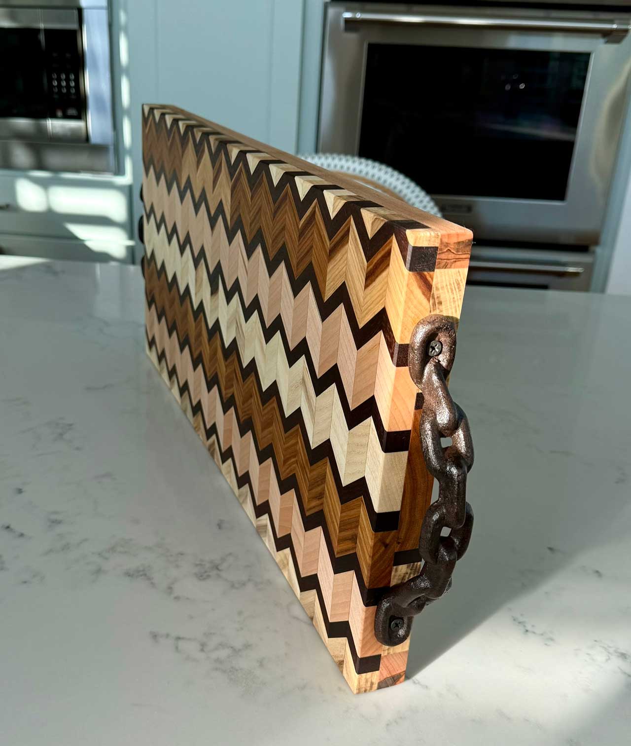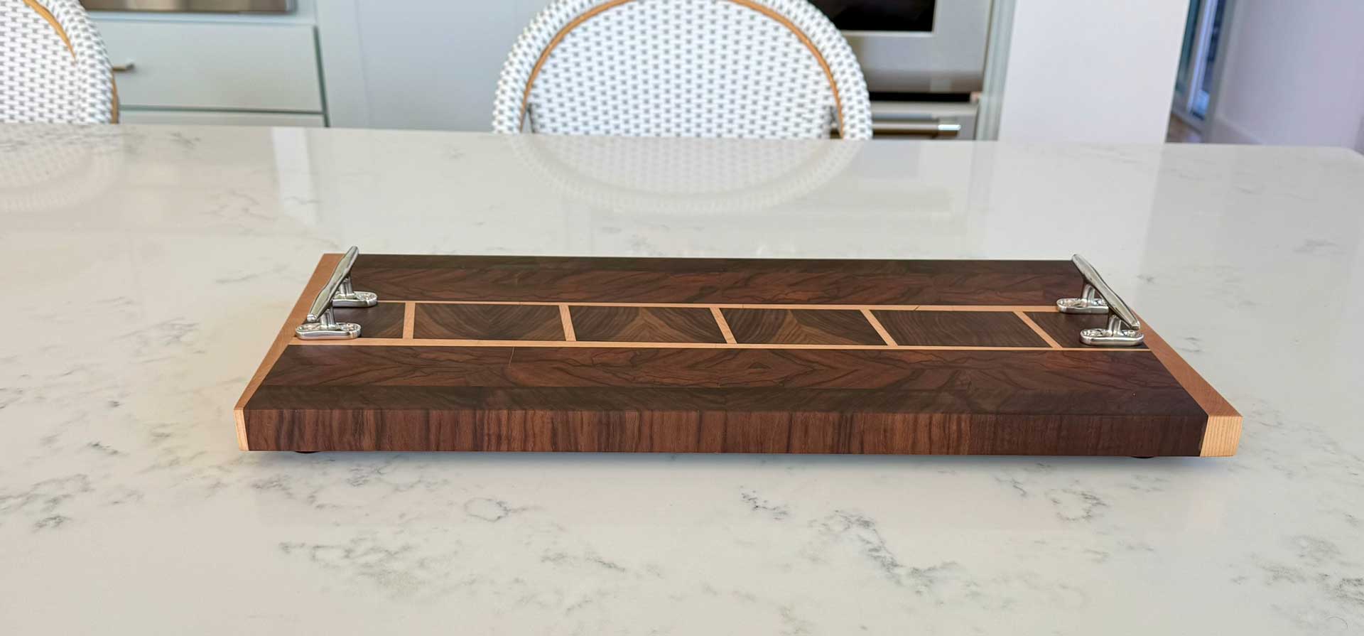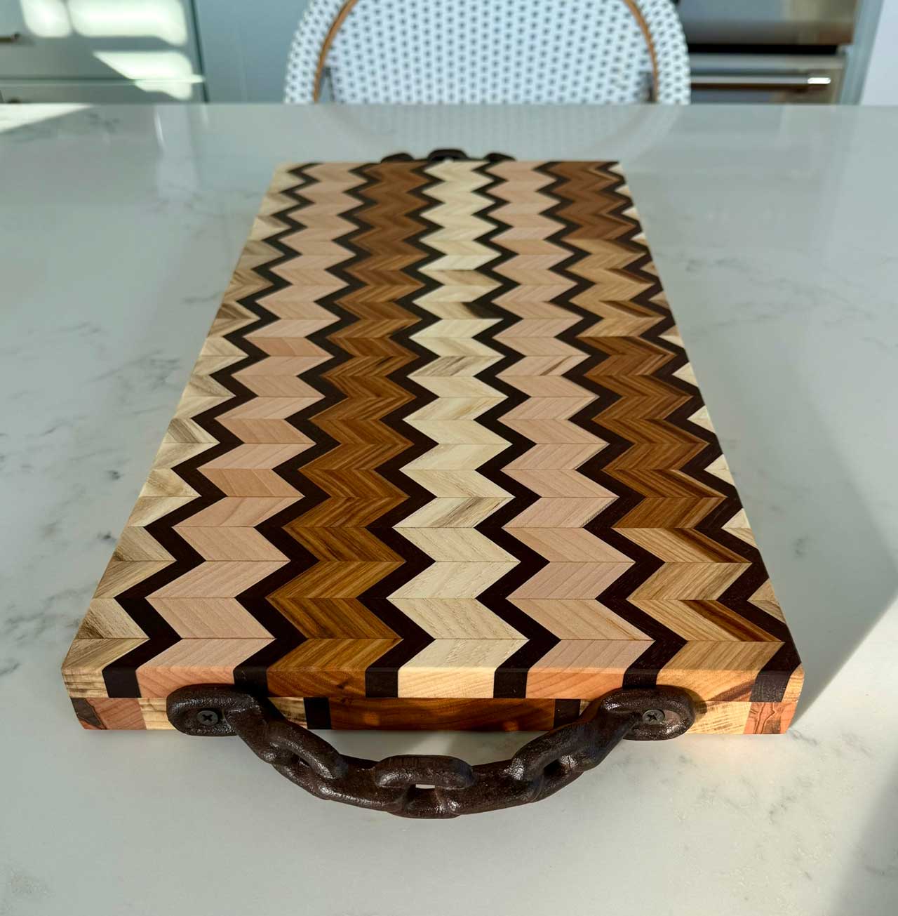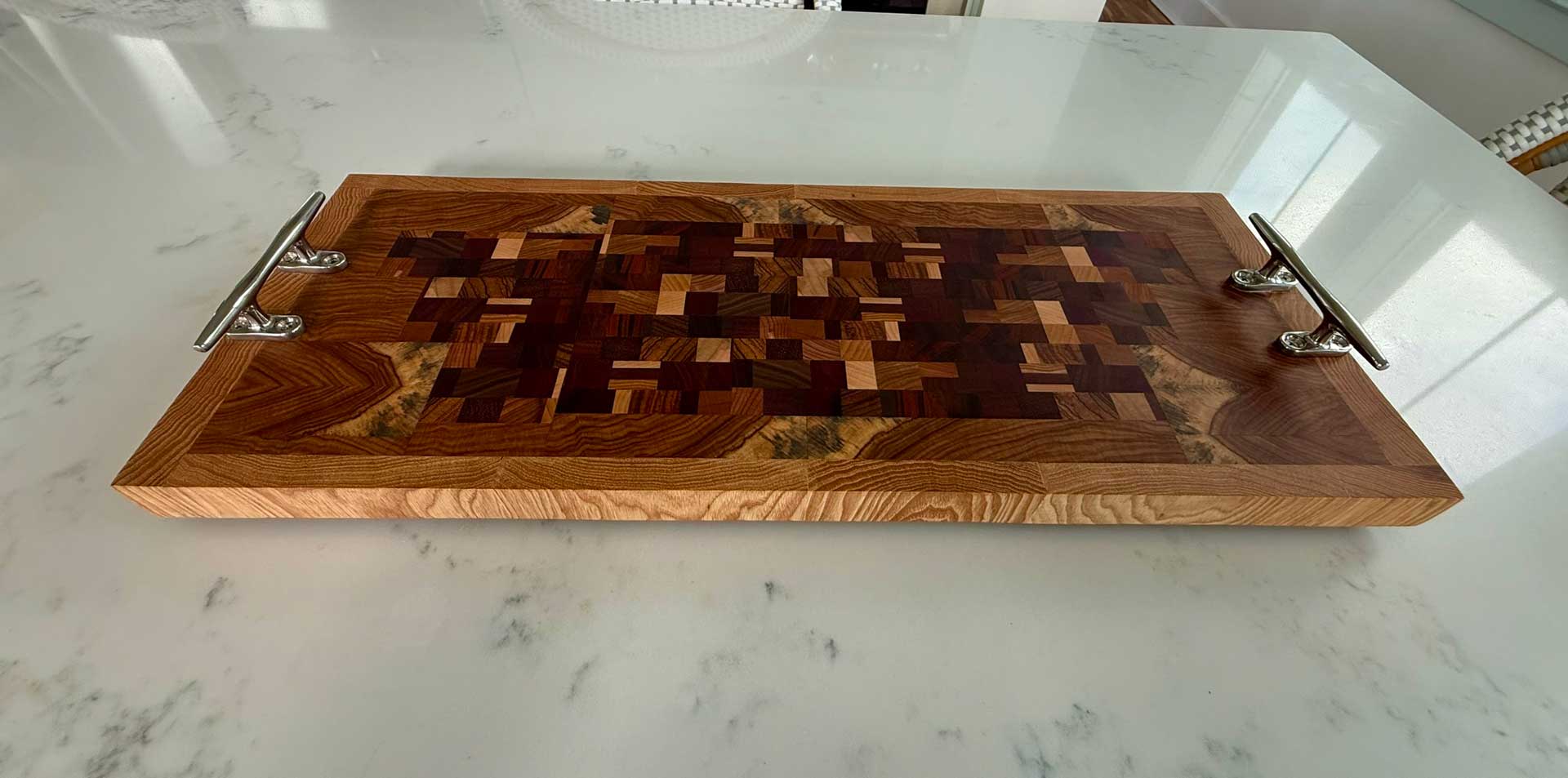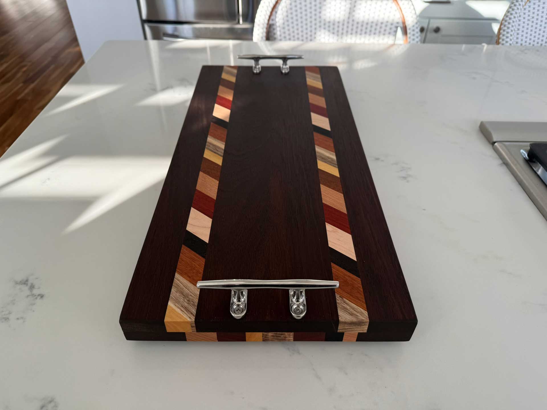 Face grain Brazilian Cherry, African Wenge & South American Yellowheart with wrought iron rope handles.