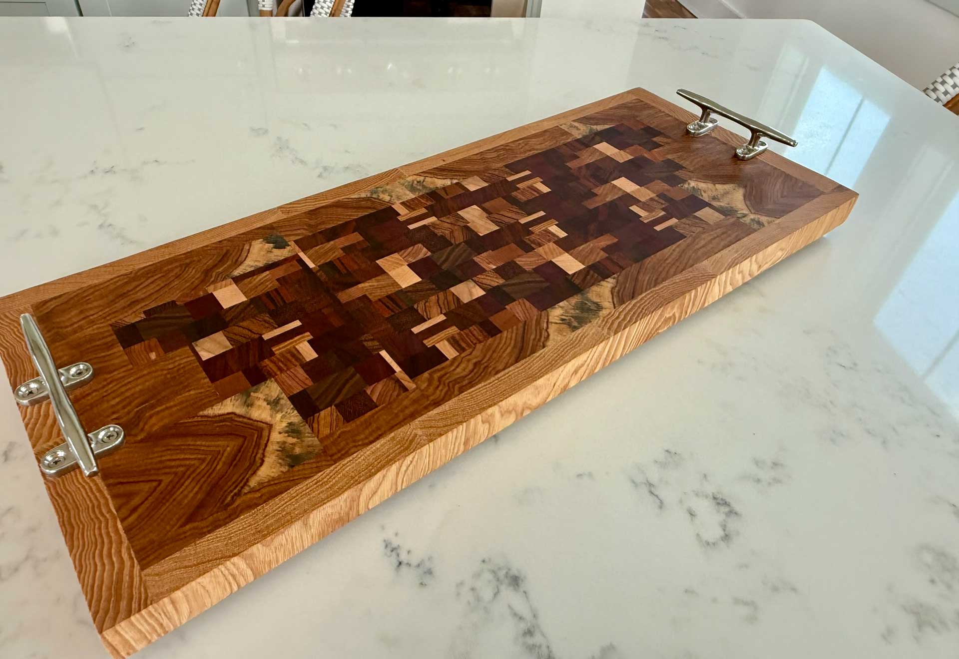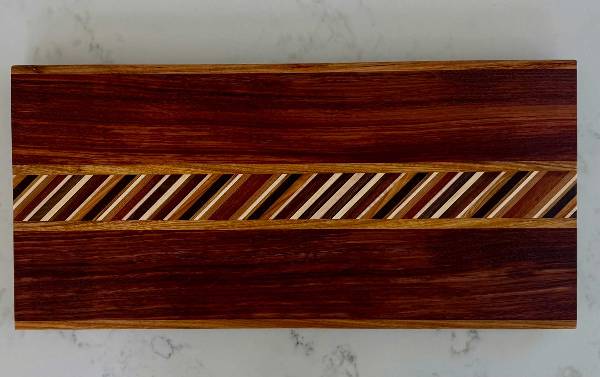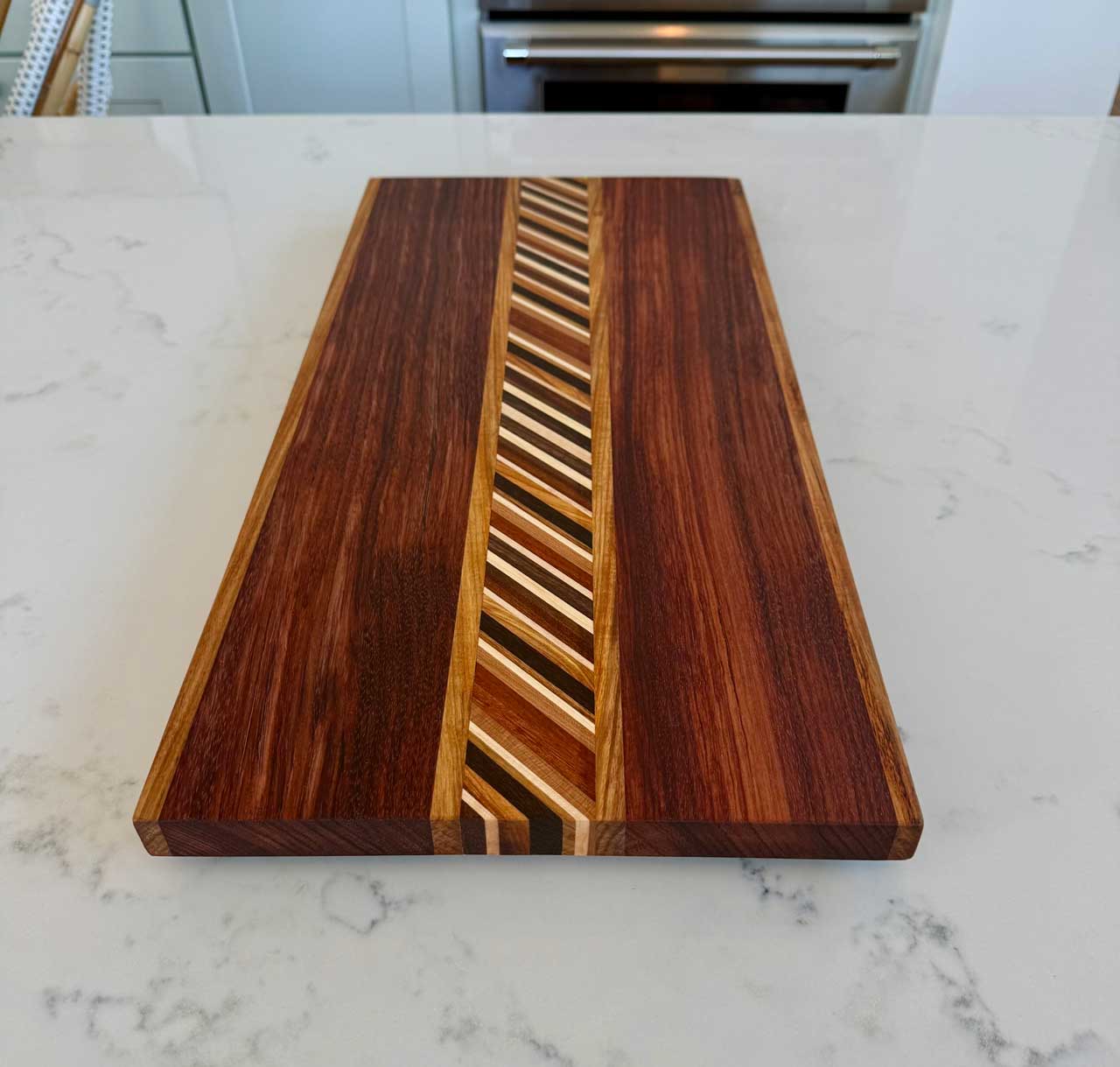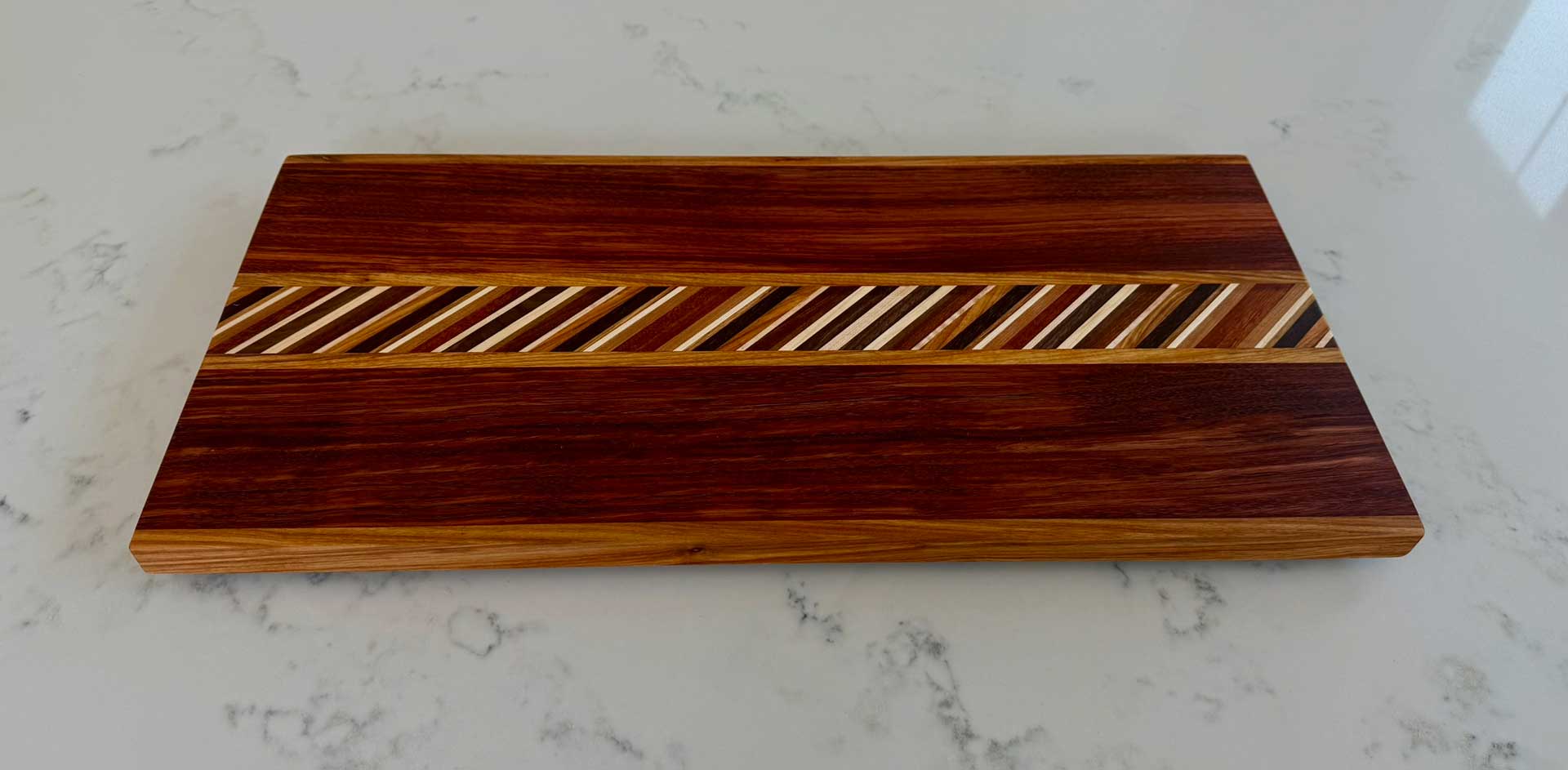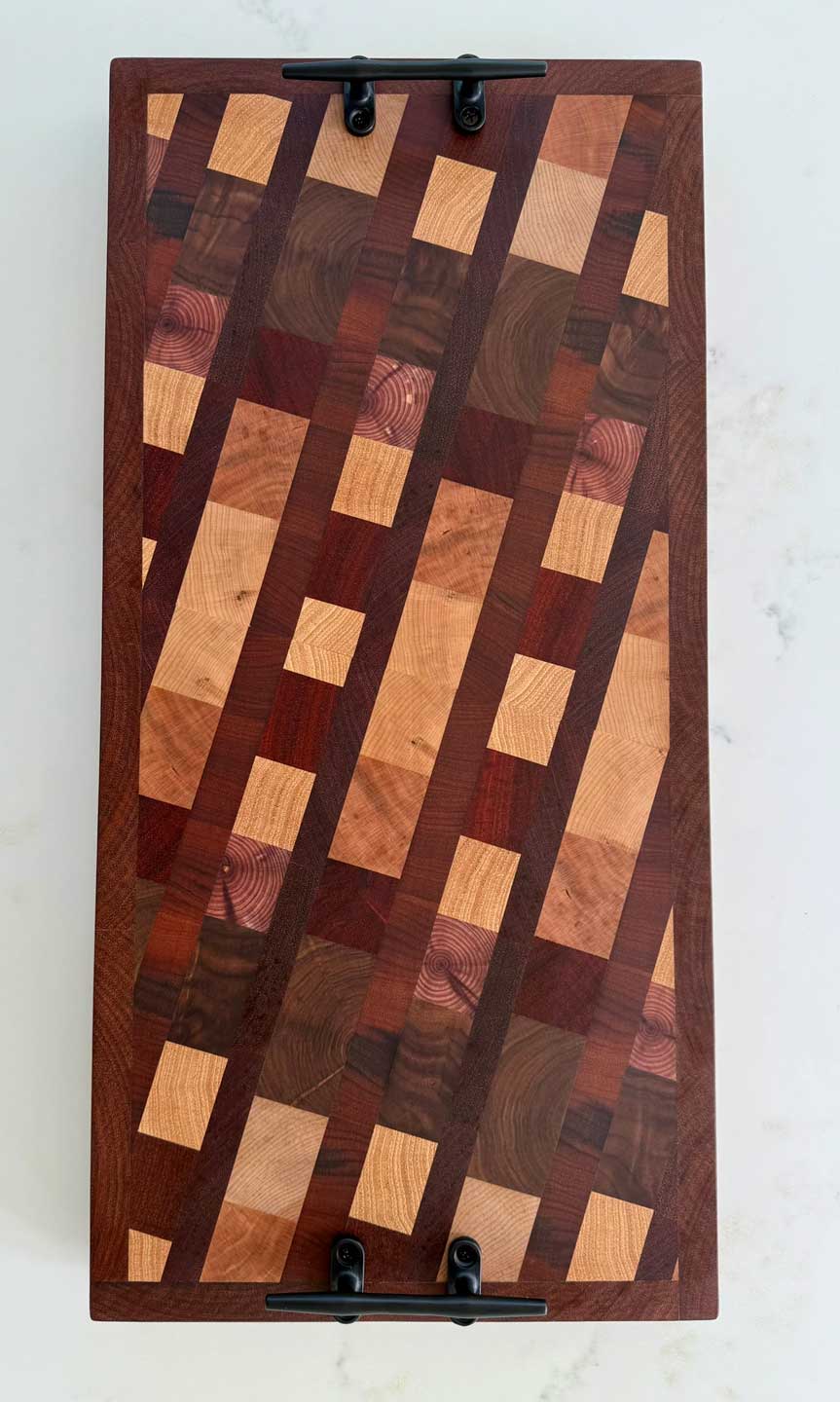 This “25° Angle End Grain Board - 112” consists of Walnut, Red Cedar, Cherry, Hickory, Maple, Mayan Cherry, Brazilian Cherry & South American Tiger Wood.