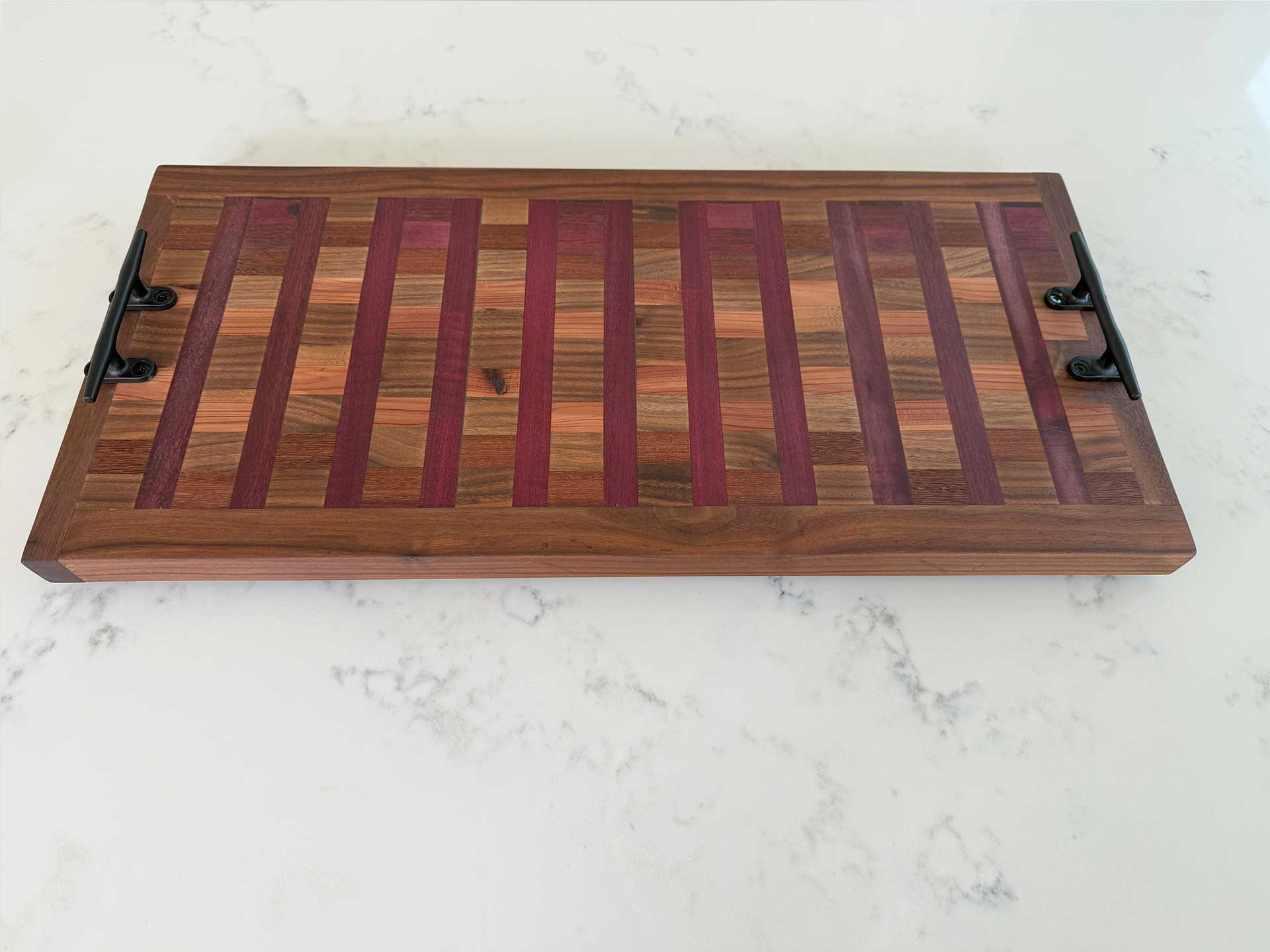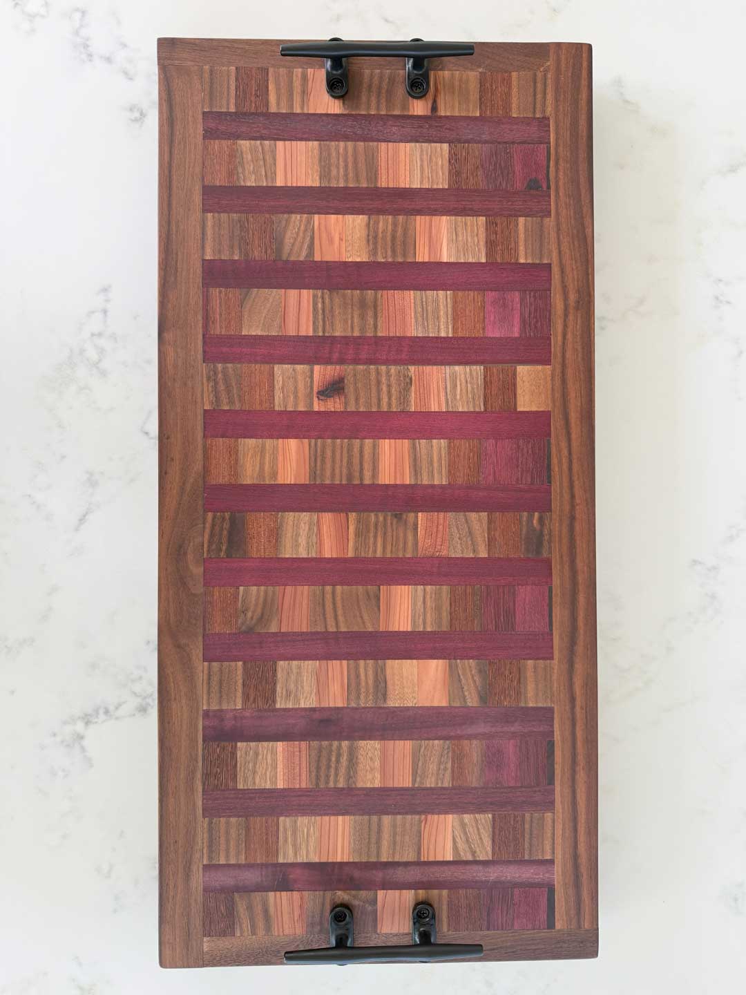 This “Dark Base Purple Stripes Charcuterie Board 108” consists of Walnut, African Purpleheart, Red Cedar and Mayan Walnut.