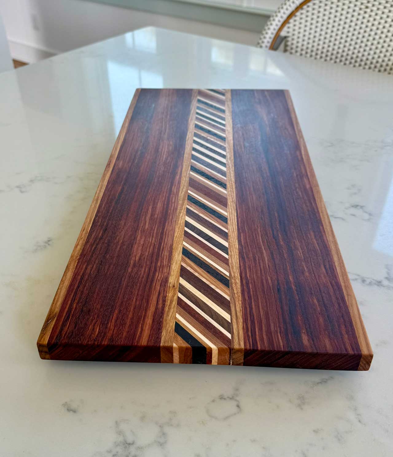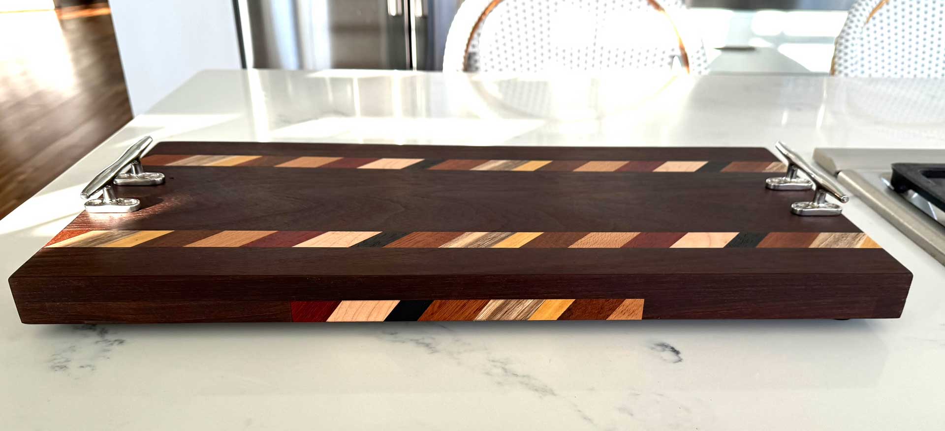 The “Peruvian Multi Striped Board 114” consists of face grain South American Peruvian Walnut, Tiger Wood & Yellowheart, African Sapele, Wenge, Padauk & American Spalted Hachberry.